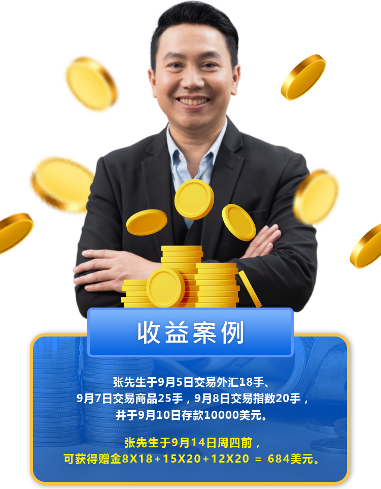 净入金说明:累计净入金是每周一至当周周日,客户所有入金金额减去所有取款总额。例如:活动开始后,客户于9/4取款300美金,然后9/5存款400美金,则实际净入金为100美元,无法参加活动。
