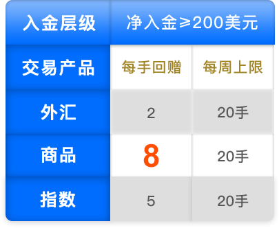 ≥200美元2美元/手 8美元/手 5美元/手 当周净入金