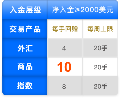 ≥2000美元4美元/手 10美元/手 8美元/手 当周净入金