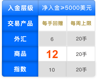 ≥5000美元6美元/手 12美元/手 10美元/手 当周净入金
