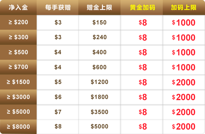 黄金加码:活动中交易黄金相关产品 (不含现货黄金(当周)) ,除原有层级返赠,额外加码每手8美元,层级最高上限2000美元赠金。