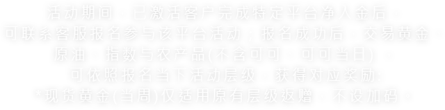 活动期间,已激活客户完成特定平台净入金后,可联系客服报名参与该平台活动;报名成功后,交易黄金、原油、指数与农产品(不含可可、可可(当日)),可依照报名当下活动层级,获得对应奖励: