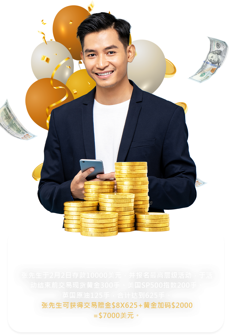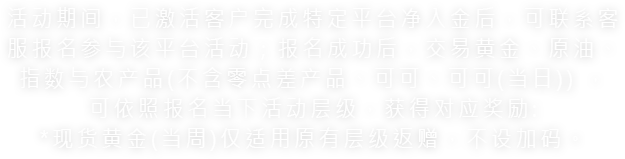 活动期间,已激活客户完成特定平台净入金后,可联系客服报名参与该平台活动;报名成功后,交易黄金、原油、指数与农产品(不含零点差产品、可可、可可(当日) ),可依照报名当下活动层级,获得对应奖励: *现货黄金(当周)仅适用原有层级返赠,不设加码。